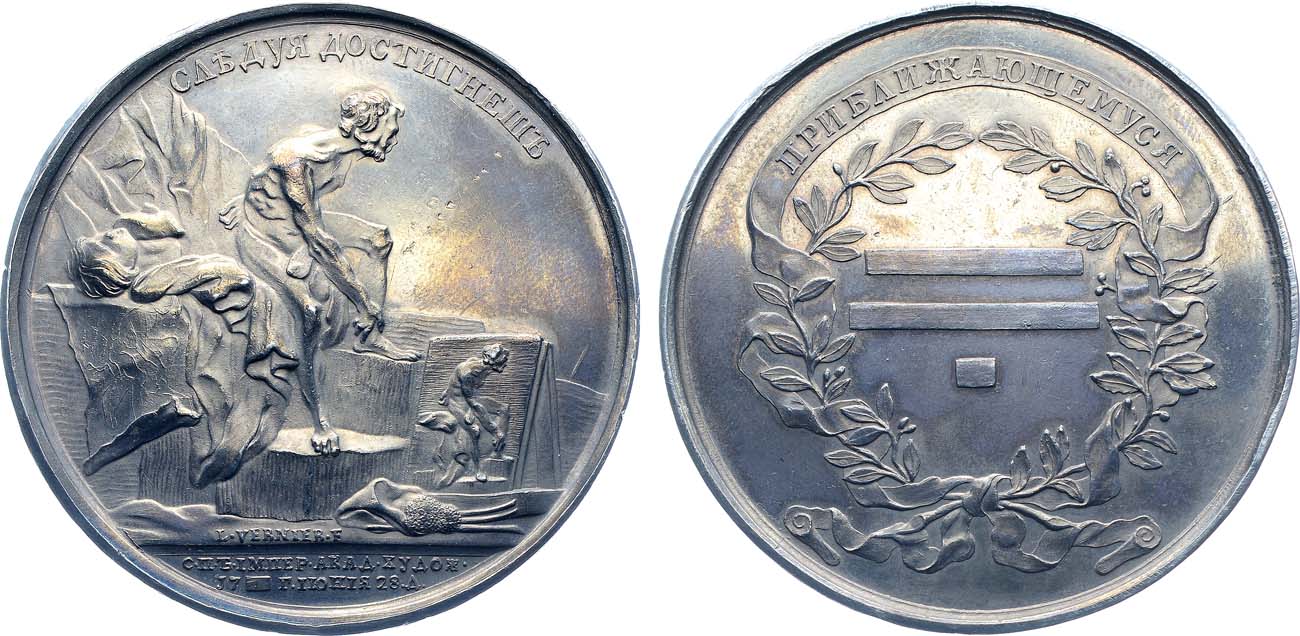 Серебро. 68,61г. Диаметр 53 мм. Санкт-Петербургский монетный двор, вторая половина XVIII века. Медальер П.-Л. Вернье (на аверсе на 6 часов "L·VERNIER·F"). Дьяков 129.1(R3). AU.