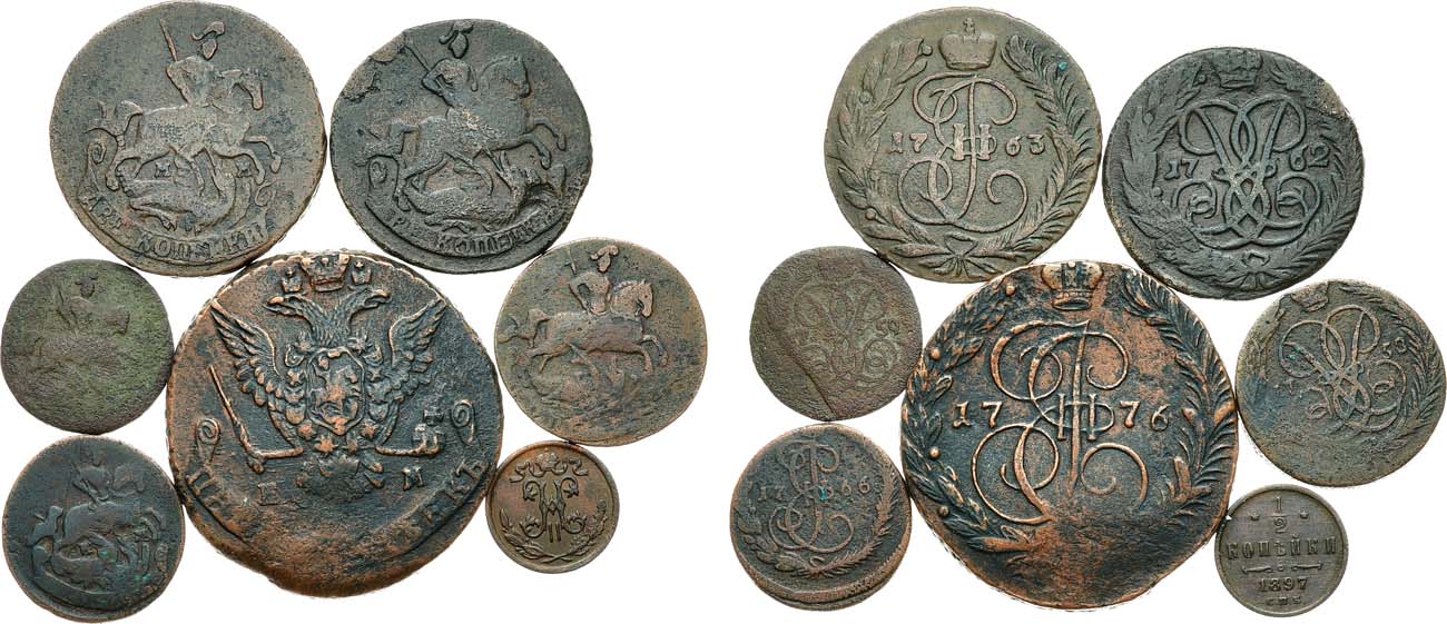 Медь. 5 копеек 1776 ЕМ, 2 копейки 1762, 2 копейки 1763 ММ, 1 копейка 1758, денга 1766 ЕМ, денга 1759, 1/2 копейки 1897 СПБ. G-XF.