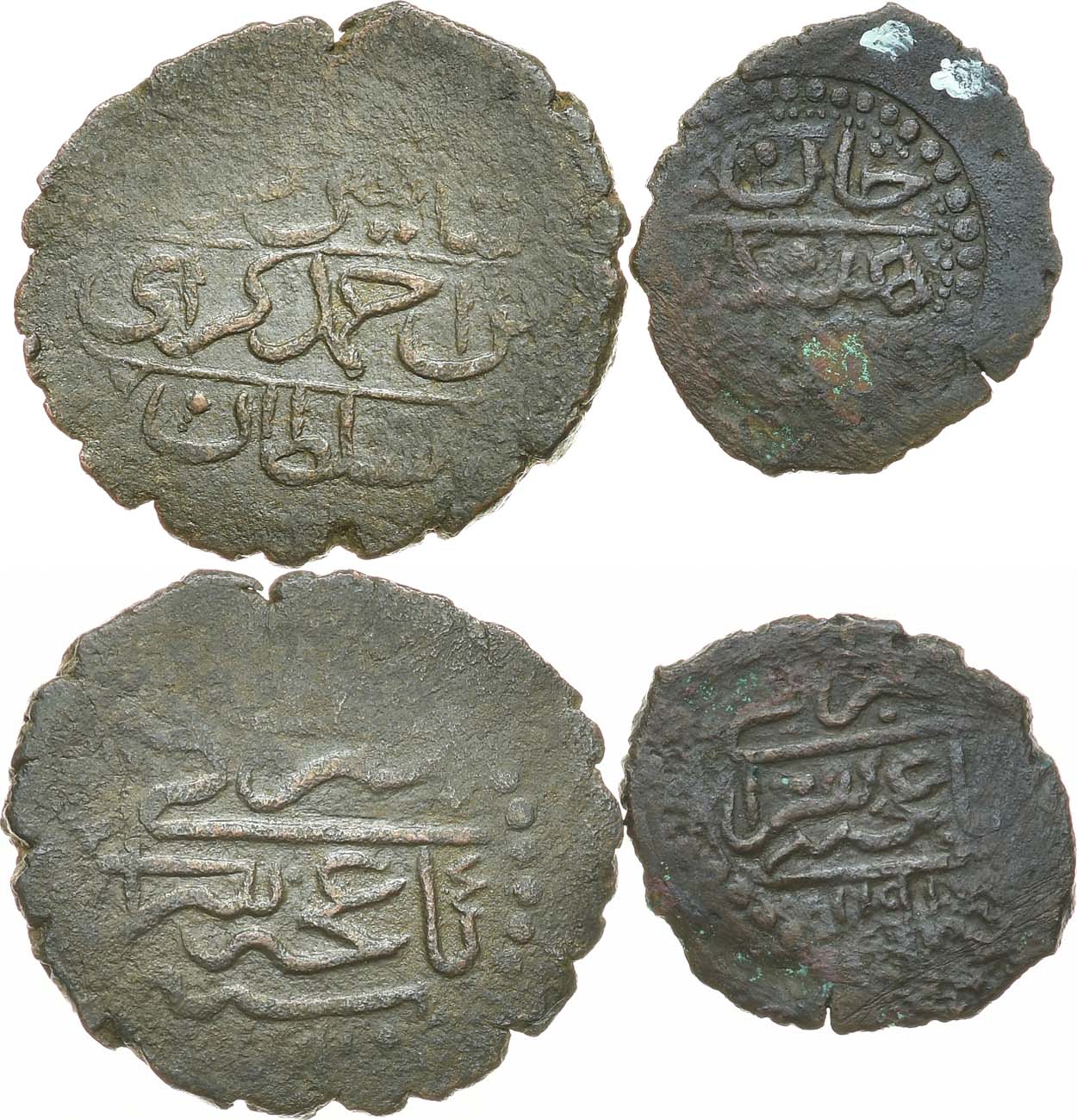 Биллон. Крымское ханство. Хан Шихин-Гирей. Кара-Оннлык 1777 (4 год правления). Биллон. 2,91 г. Тамга вверху, год правления арабской цифрой. Сариев 73. XF. Крымское ханство. Хан Шихин-Гирей. Кара-Бешлык 1777 (2 год правления). Биллон. 1,18 г. Непрочекан. Сариев 83? XF-. XF-/XF.