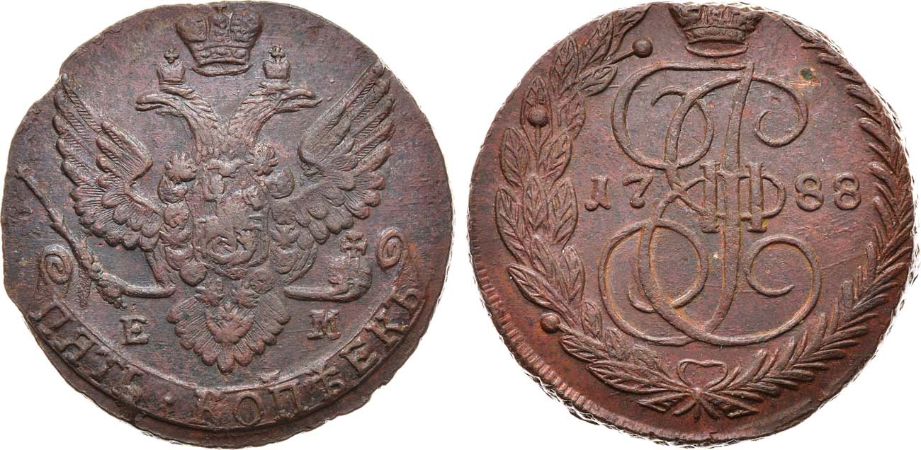 Медь. 48,42г. Аверс: орел нового образца 1788-1796 гг. Реверс: вензель и корона большая. Уздеников 2793. Биткин 642. Дьяков 172, 597. Brekke 121, 270. AU/UNC.