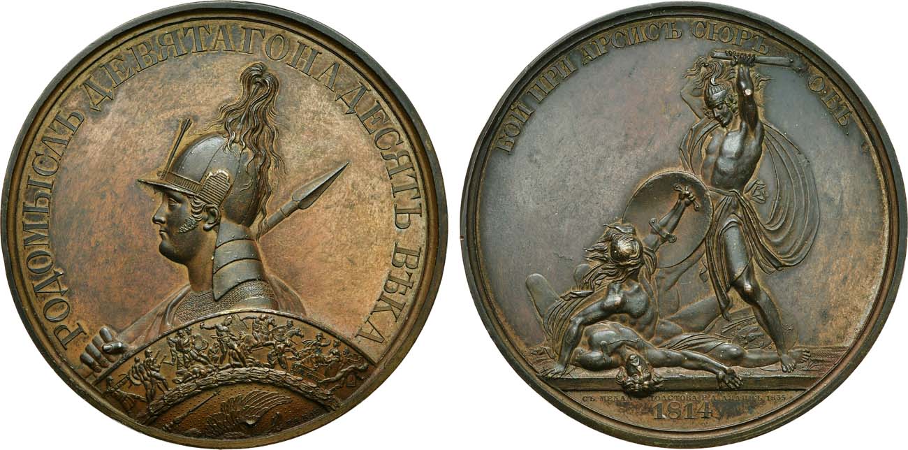 Бронза. 123,76г. Диаметр 65 мм. Санкт-Петербургский монетный двор. Из серии медалей на события Отечественной войны 1812 г. Медальер А.А. Клепиков (на аверсе на 5 часов "Р.А.КЛЕ", на реверсе в одну строку: "СЪ МЕДАЛ Г ТОЛСТОВА Р.А. ЛЯЛИНЪ 1835."). Смирнов 156/387. Дьяков 1778(R1). AU.