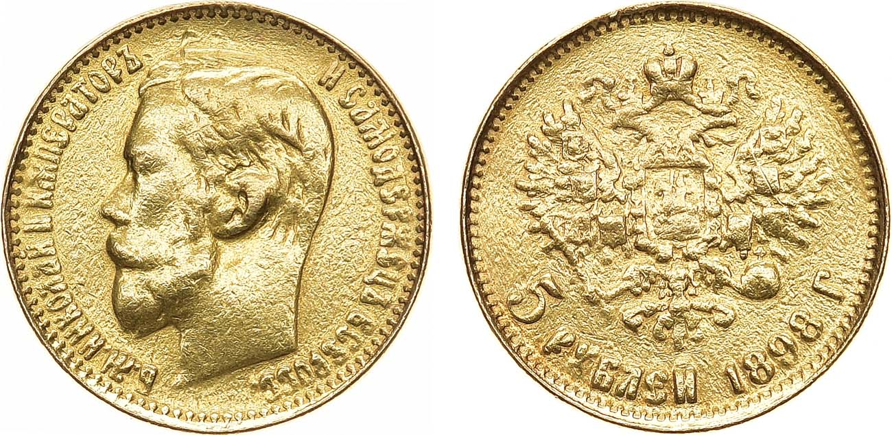 Золото. 4,26г. Аверс: штемпель 1898 года (портрет рельефный, ободок узкий). Уздеников 0329. Биткин 20. Казаков 109. F.