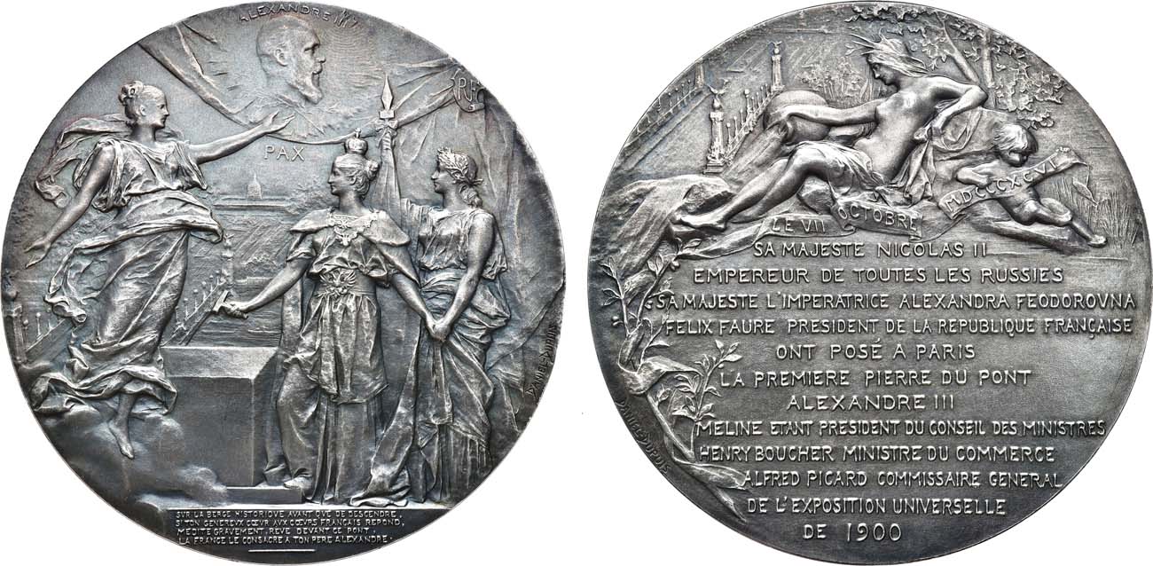 Бронза, серебрение. 139,11г. Диаметр 70 мм. Франция, Парижский монетный двор. Медальер Ж.Б. Даниель-Дюпюи. Аверс: справа на поле "DANIEL-DUPUIS". Реверс: слева внизу на поле "DANIEL-DUPUIS". Клейма на гурте: Парижского монетного двора (рог изобилия) и "BRONZE". Дьяков 1320.1(R1). UNC.