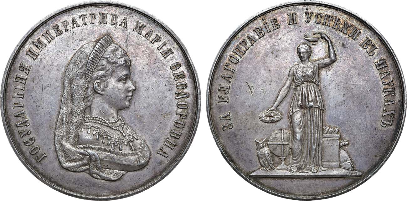 Серебро. 25,17г. Диаметр 42 мм. Санкт-Петербургский монетный двор, конец XIX - начало XX в. Медальер А. Грилихес (на обрезе корсажа внизу слева "А.Г.", на реверсе на обрезе справа "ГРИЛИХ"). Смирнов 1107/а. Дьяков 909.6(R0). AU.