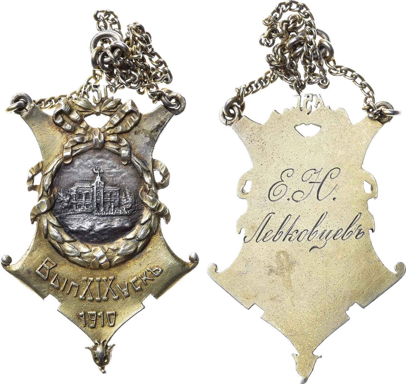 Серебро, золочение, оксидирование. 9,72г. Размеры: 37х27 мм. С оригинальной цепочкой для ношения. Гравировка на реверсе: "Е.Н. Левковцевъ". Российская Империя, 1910 год. UNC.