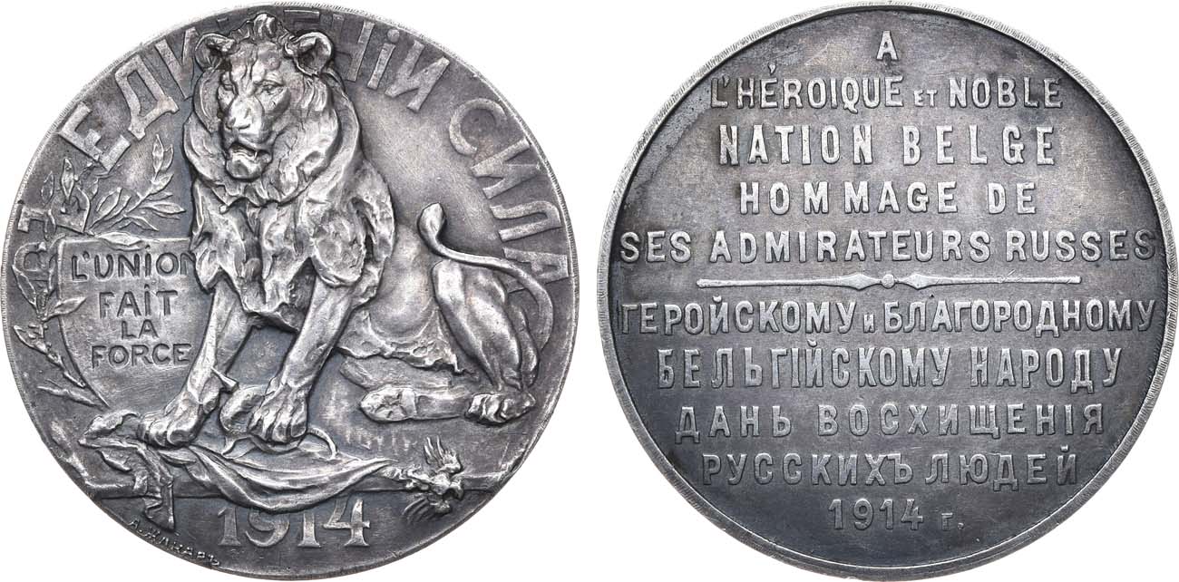 Серебро. 18,75г. Из серии медалей Российского Общества нумизматов в память Первой мировой войны 1914–1918 гг. Диаметр 32,3 мм. Петроград, 1914 г. Мастерская (ателье) А.Ф. Жакара (аверс — внизу слева у окружности: "А.ЖАКАРЪ"). Медальер Г.И. Малышев (без подписи). Дьяков 1581.1(R1). UNC.