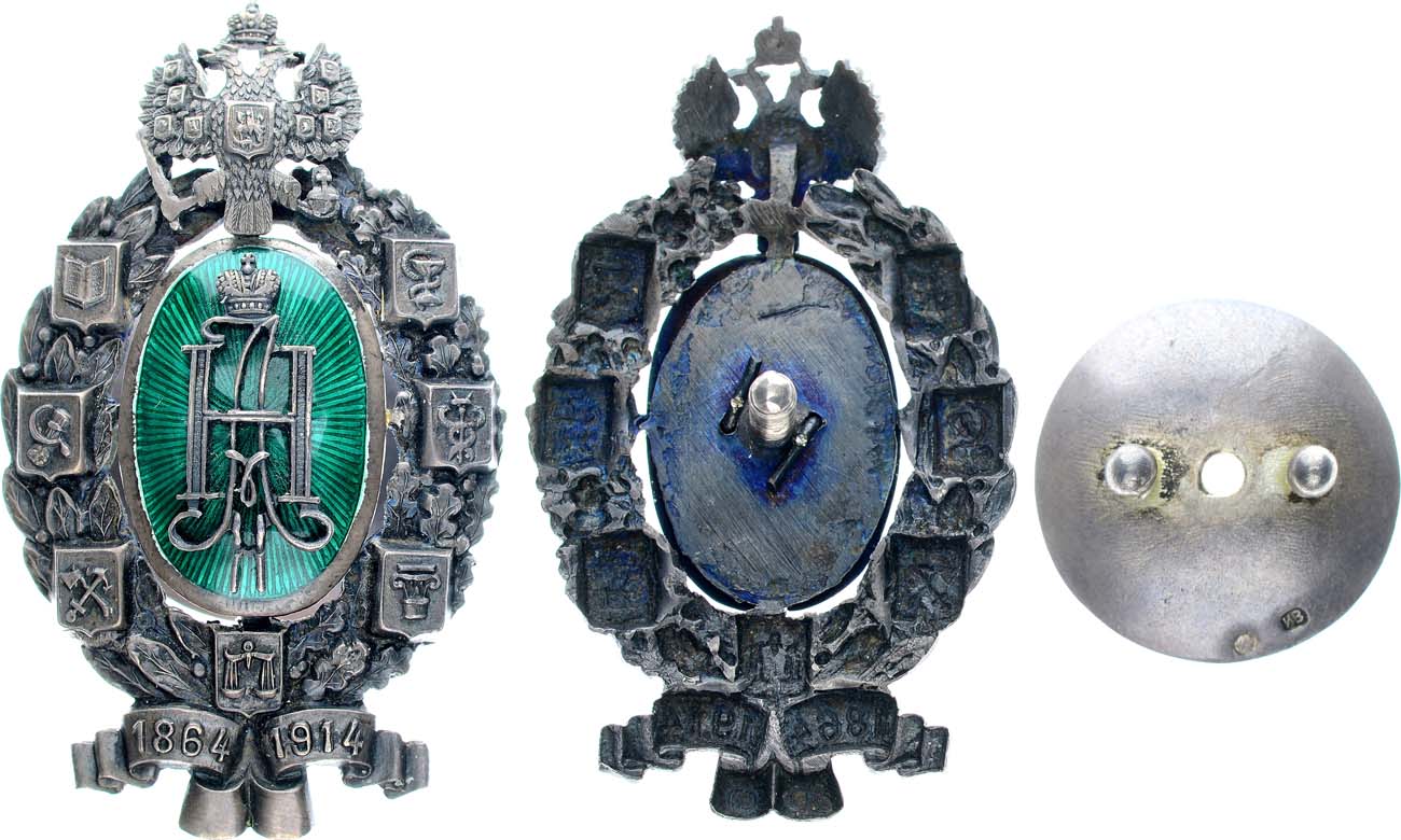 Серебро, гильоширование, эмаль. 24,14г. Размеры: 62х36 мм. Клейма на знаке: 1. Московского окружного пробирного управления после 1908 г. ("дельта", женская голова в кокошнике вправо, "84") в овальном щитке. 2. Фирменное "ИВ" в прямоугольном щитке. 3. Знак удостоверения Московского окружного пробирного управления после 1908 г. (женская голова в кокошнике вправо с точкой сзади) в круглом щитке. Клейма на гайке: 1. Знак удостоверения после Московского окружного пробирного управления 1908 г. (женская голова в кокошнике вправо с точкой сзади) в круглом щитке. 2. Фирменное "ИВ" в прямоугольном щитке. Российская Империя, Москва, 1914 г. Патрикеев, Бойнович.1. № 4.22б. UNC.