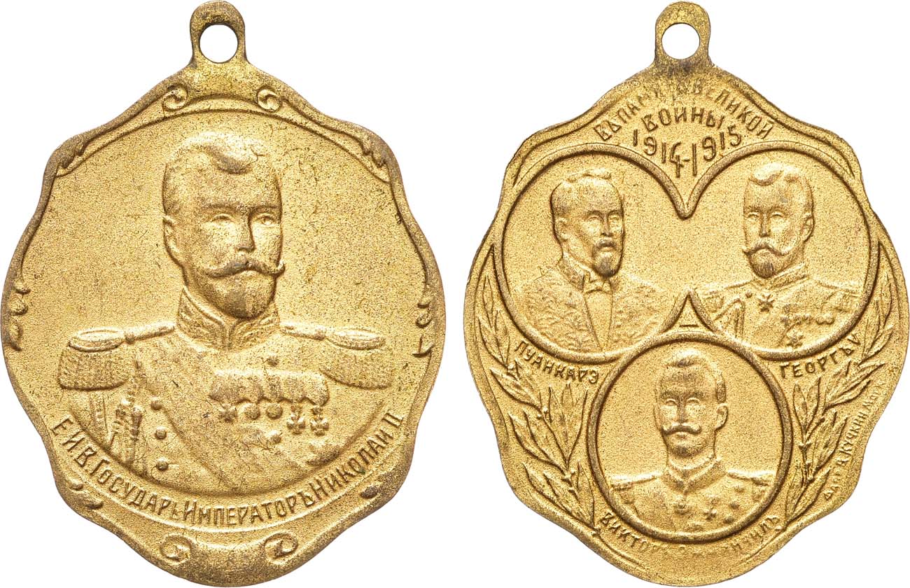Бронза золочение. 5,12г. Диаметр 27 мм. Москва, 1915 г. Фабрика Д.Л. Кучкина (на реверсе справа вдоль края: "ФАБР. Д.КУЧКИН. МОСКВ."). AU/UNC.