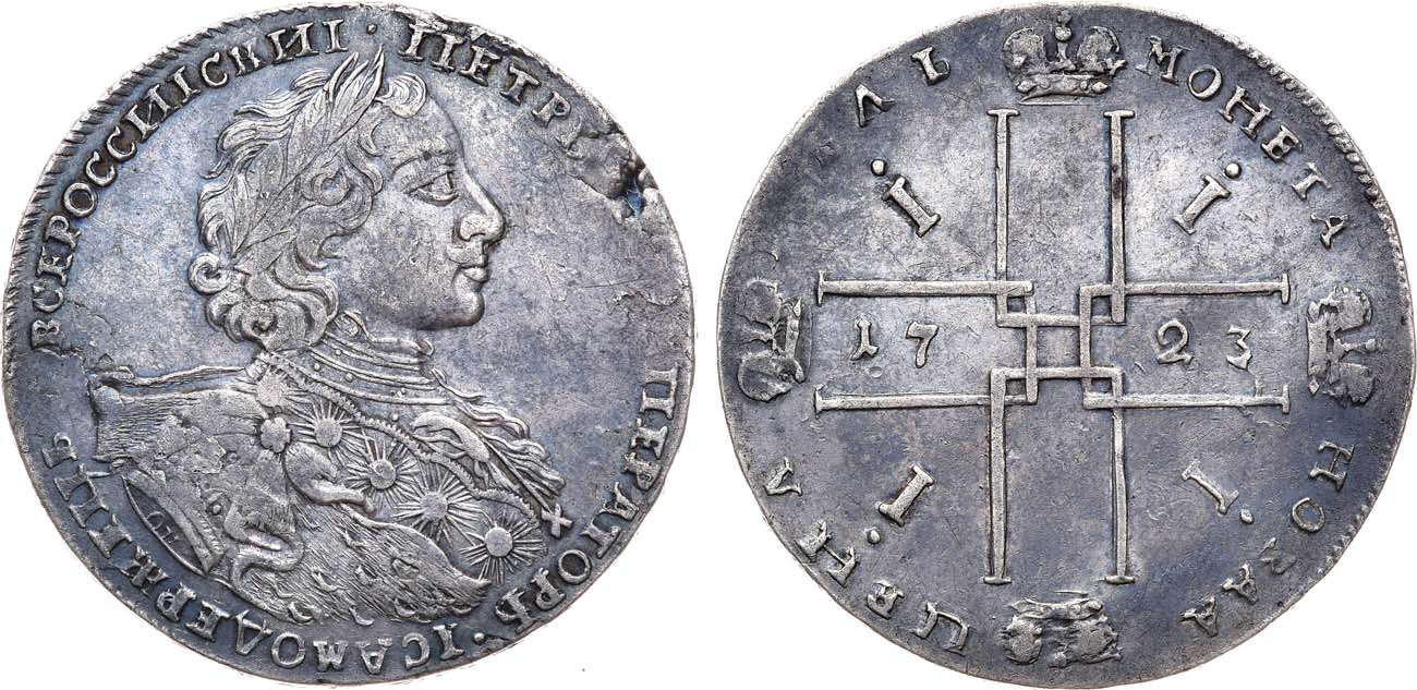 Серебро. 28,78г. Красный монетный двор. Тип 1723 года. Портрет в горностаевой мантии. Малый крест на груди императора. Аверс: точка над головой. Реверс: малая монограмма с малыми коронами. Уздеников 607. Биткин подобна 848. 3 рубля 50 копеек по Петрову. Дьяков 261,1287(R1). AU.