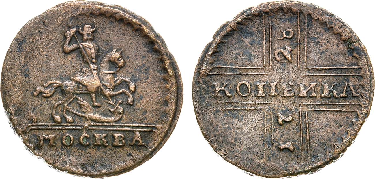 Медь. 4,17г. Кадашевский монетный двор. Аверс: "МОСКВА" малыми буквами, шляпа у всадника с малыми полями, ошибка в написании номинала: "КОI IЕЙКА". Уздеников 2473. Биткин подобна 189(R). Дьяков подобна 116, 8. Brekke 72, 8. AU.