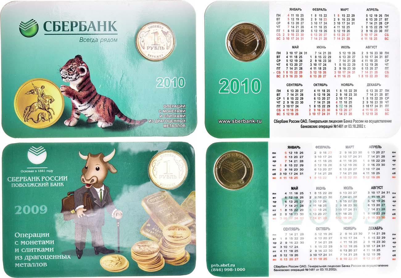 Латунь. Жетон 2009 и 2010 гг. Сбербанка России в буклетах с календариками Диаметр 20 мм. Московский монетный двор. UNC.