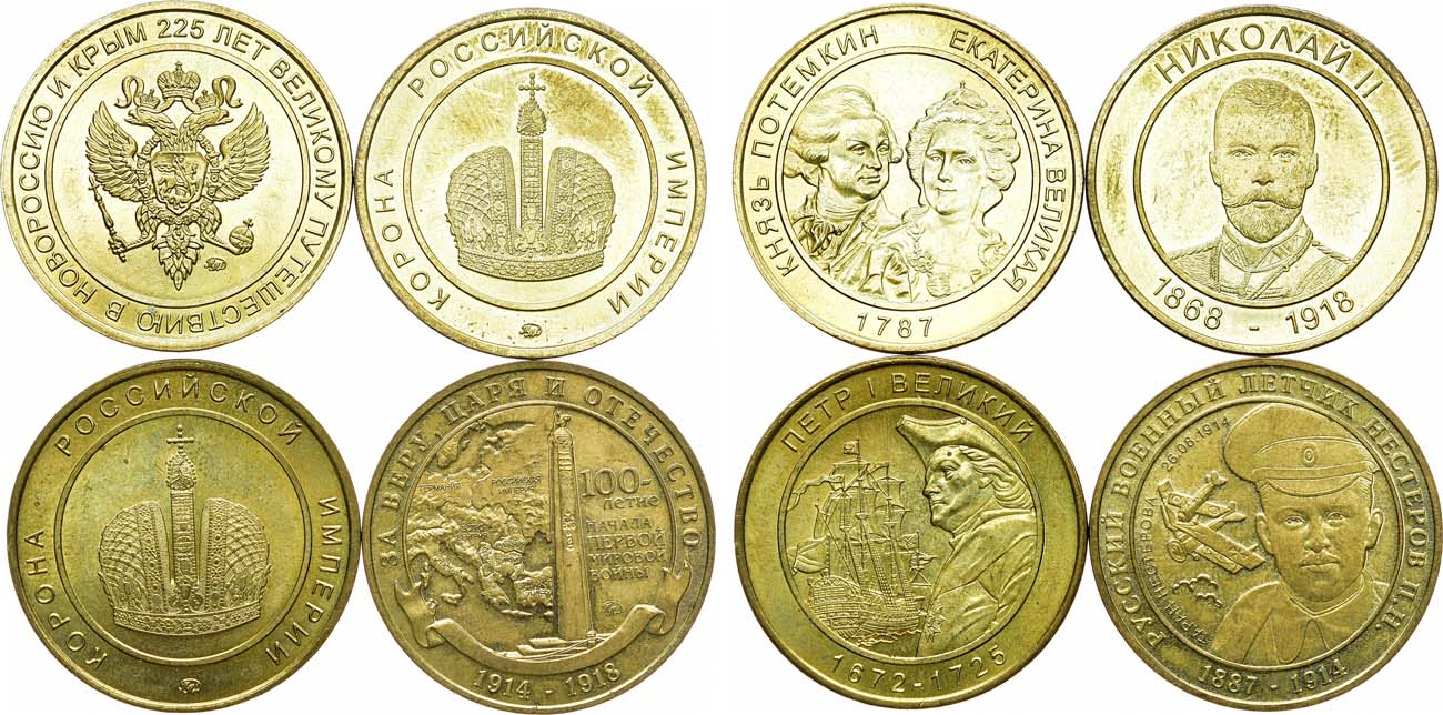 Латунь. Жетон. Петр I Великий 1672-1725 / Корона Российской империи. Диаметр 27 мм. ММД. Латунь. 7,37 г. UNC. Жетон. Николай II 1868-1918 / Корона Российской империи. Диаметр 27 мм. ММД. Латунь. 7,37 г. UNC. Жетон 2014 года. Серия "100-летие Первой Мировой войны". Русский военный лётчик Нестеров П.Н. Первый таран. Диаметр 27 мм. ММД. Латунь. 7,37 г. UNC. Жетон. Серия "225 лет великому путешествию в Новороссию и Крым". Князь Потёмкин и Екатерина Великая 1787. Диаметр 27 мм. ММД. Латунь. 7,37 г. UNC. UNC.