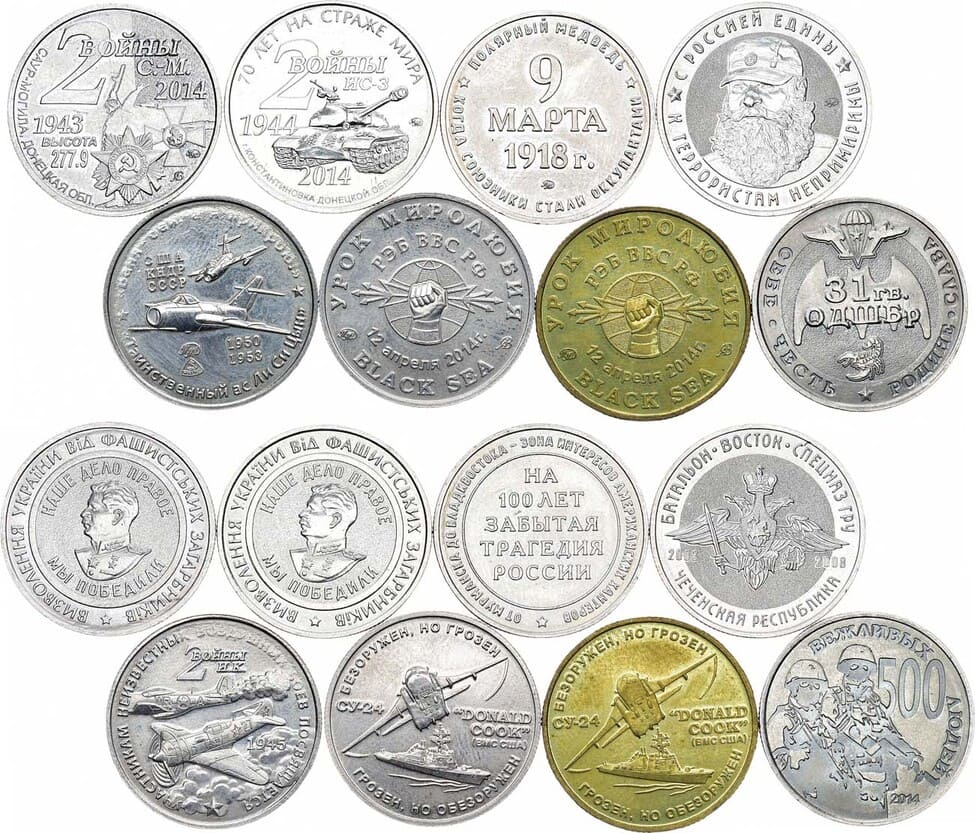 Жетон 2014 года. Серия "Две войны". ИС-3, 70 лет на страже мира 1944-2014 гг. ММД. Медно-никелевый сплав. 6,1 г. UNC. Жетон 2014 года. Серия "Две войны". Высота 277.9, Саур-могила. 1943-2014 гг. ММД. Медно-никелевый сплав. 6,32 г. UNC. Жетон 2014 года. Серия "Две войны". Участникам воздушных боёв посвящается. ММД. Медно-никелевый сплав. 6,2 г. UNC. Жетон 2018 года. На 100 лет забытая трагедия России. Союзники оккупанты. ММД. Медно-никелевый сплав. 7,53 г. UNC. Жетон 2014 года. Безоружен, но грозен СУ-24. Урок миролюбия 12 апреля. ММД. Медно-никелевый сплав. 6,82 г. UNC. Жетон 2014 года. Безоружен, но грозен СУ-24. Урок миролюбия 12 апреля. ММД. Латунь. 6,28 г. UNC. Жетон 2014 года. 500 вежливых людей. 31 гв. ОДШБр себе честь, родине слава. ММД. Медно-никелевый сплав. 6,76 г. UNC. Жетон 2008 года. Батальон Восток СПЕЦНАЗ ГРУ, Чечня. С Россией едины. ММД. Медно-никелевый сплав. 8,47 г. UNC. Жетон 2008 года. Батальон Восток СПЕЦНАЗ ГРУ, Чечня. С Россией едины. ММД. Медно-никелевый сплав. 8,47 г. UNC. UNC.