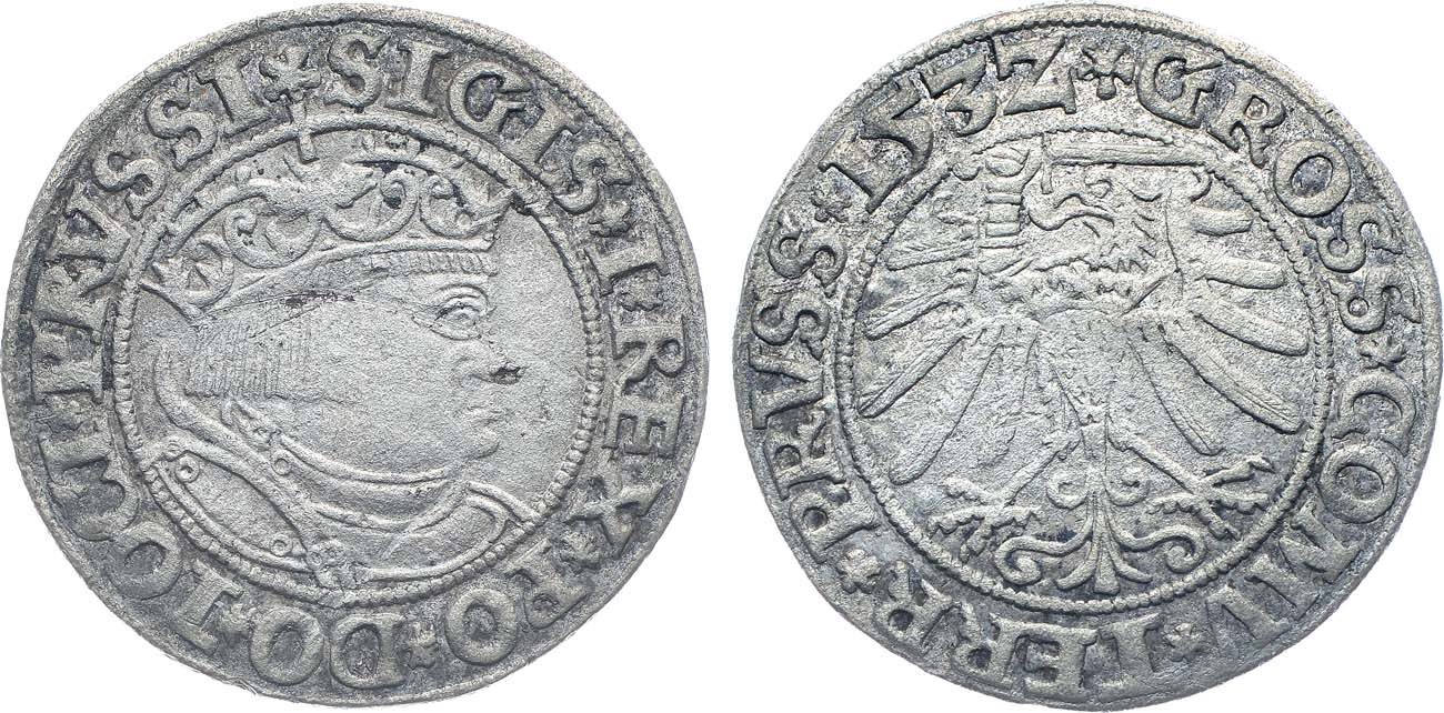 Серебро. 1,87г. Торунь. Аверс: в жемчужном ободке орел Королевской Пруссии, во внешнем ободке легенда, начинающаяся с пятилепестковой розетки: GROSS*COMV*TERR*PRVSS*153Z. Реверс: в жемчужном ободке королевский бюст в короне и пластинчатых доспехах, обращен вправо, во внешнем ободке легенда: *SIGIS*I*REX*PO*DO*TOCI*PRVSSI Romańczyk GT1532_36. XF.