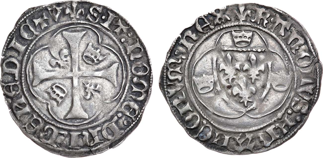 Серебро. 2,33г. Аверс: щит с лилиями и коронами; легенда "+ KAROLVS FRANCORVM REX". Реверс: крест внутри четырехлистника, окружённый лилиями и коронами; легенда "+ SIT NOME DNI BENEDICTV". VF/XF.