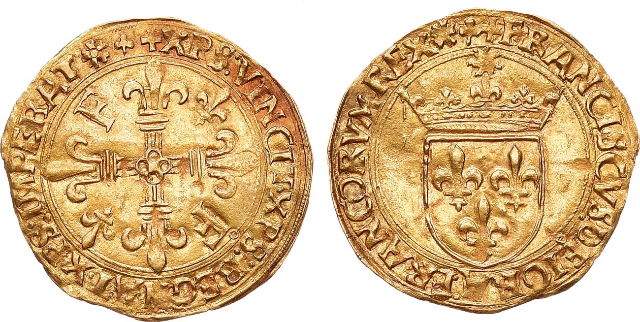 Золото. 3,39г. Париж. Аверс: изображение герба Франции; круговая легенда "+ FRANCISCVS: DEI: GRA: FRANCORVM: REX". Реверс: изображение креста с лилиями и монограммами "F"; круговая легенда "+ XPS: VINCIT XPS: REGNAT: XPS: IMPERAT". AU.