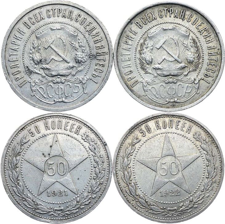 Серебро. 50 копеек 1921 года. (АГ). Серебро. 10,00 г. ФедоринVI 1 (6 у.е.). AU. 50 копеек 1922 года. (ПЛ). Серебро. 10,00 г. ФедоринVI 3 (6 у.е.). AU. AU.