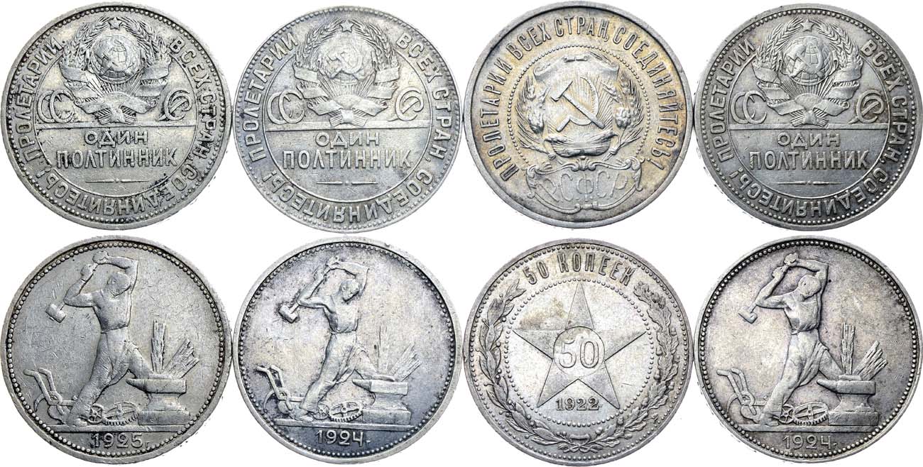 Серебро. 50 копеек 1922 года. (ПЛ). Серебро. 10,00 г. На гурте (П•Л). ФедоринVI 3 (6 у.е.). AU/UNC. Полтинник 1924 года. (ТР). Серебро. 10,00 г. На гурте (Т•Р). ФедоринVI 4 (6 у.е.). XF. Полтинник 1924 года. (ПЛ). Серебро. 10,00 г. На гурте (П•Л). ФедоринVI 13 (6 у.е.). XF/AU. Полтинник 1925 года. (ПЛ). Серебро. 9,97 г. На гурте (П•Л). ФедоринVI 21 (6 у.е.). XF. XF/UNC.
