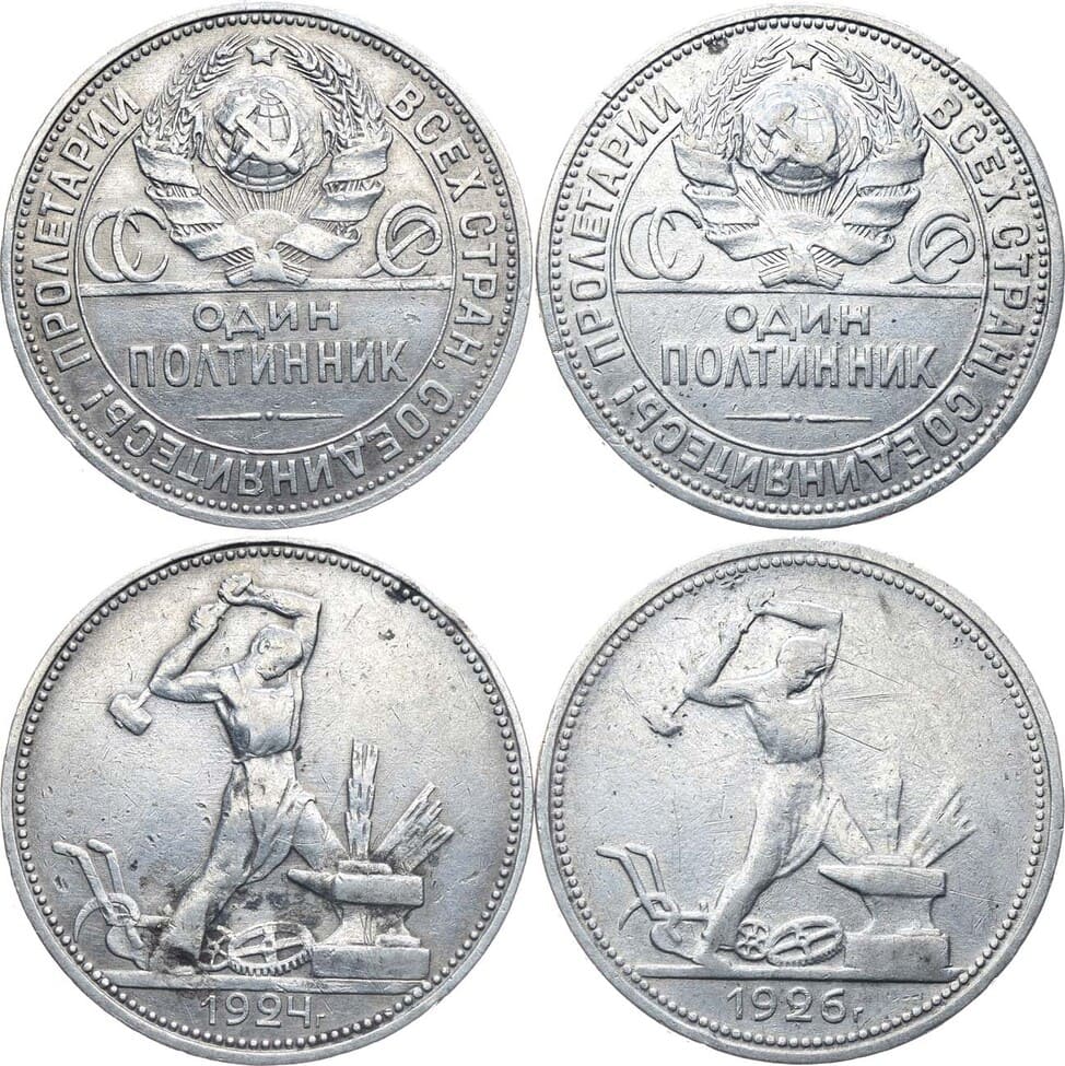 Серебро. Полтинник 1924 года. (ПЛ). Серебро, 9,98 г. Федорин 10(6 у.е.) VF. Полтинник 1925 года. (ПЛ). Серебро, 9,88 г. Федорин 19(6 у.е.) XF VF/XF.