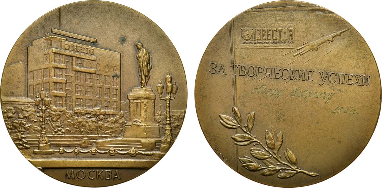 Томпак. 109,76г. Диаметр 65 мм. Ленинградский монетный двор. Медальер А.В. Соловьев (на реверсе на семь часов "Соловьев А."). Реверс: гравировка "Петру Севрюку / 1967г.". Тираж: 1039 экз. Шкурко, Салыков 238. UNC.