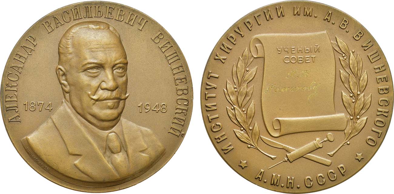 Томпак. 170,39г. Диаметр 65 мм. Московский монетный двор. Медальер С.Л. Тульчинский (на аверсе слева на обрезе портрета "ТУЛЬЧИНСКИЙ 1961"). Гравировка на реверсе в картеше, в две строки: "П.К. / Романову". Шкурко, Салыков 239. UNC.