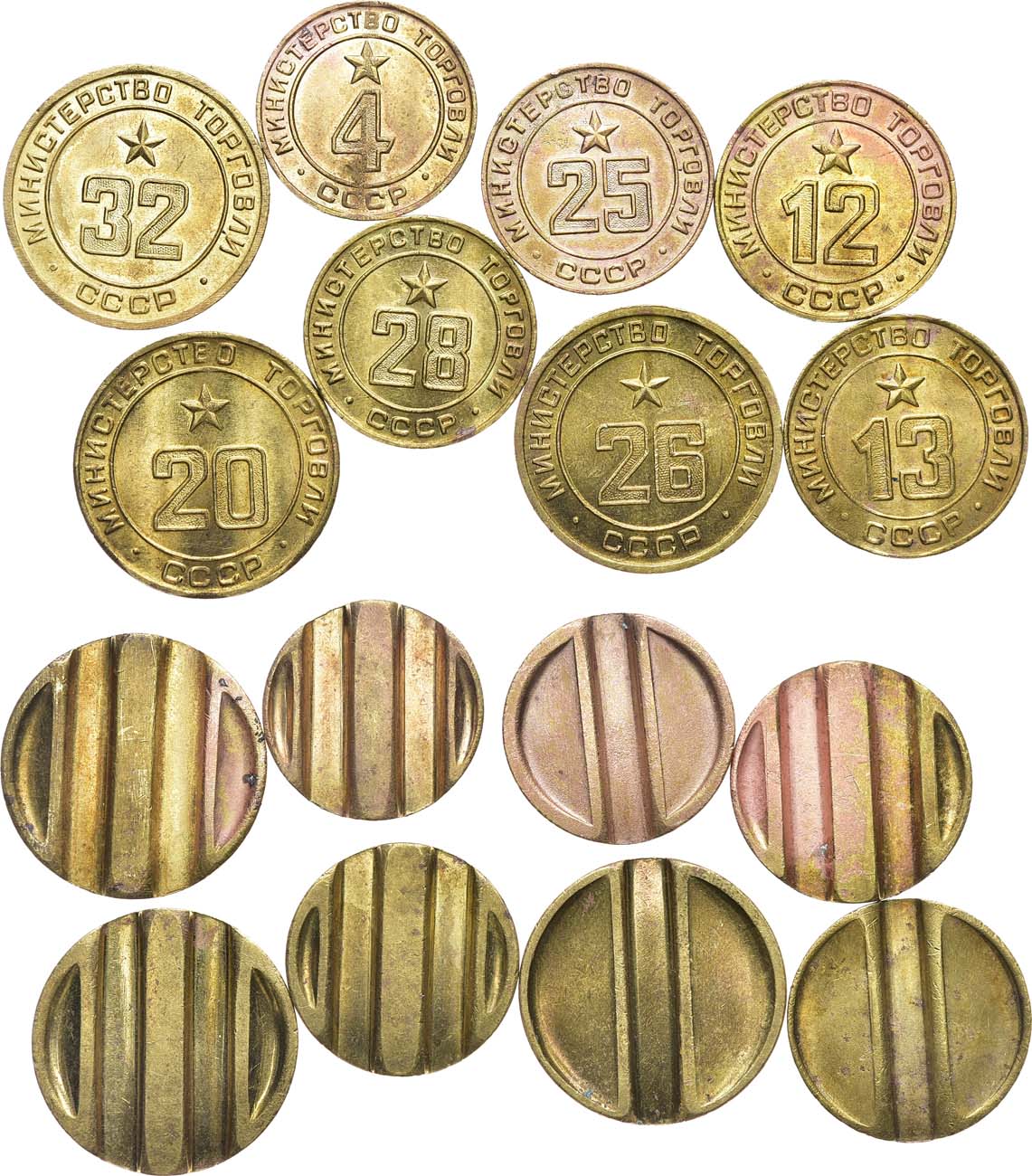 Латунь. Жетон Министерства торговли СССР №4. Латунь. 5,43 г. Диаметр 20 мм. Жетон Министерства торговли СССР №12. Латунь. 6,70 г. Диаметр 22 мм. Жетон Министерства торговли СССР №13. Латунь. 6,75 г. Диаметр 22 мм. Жетон Министерства торговли СССР №20. Латунь. 8,03 г. Диаметр 24 мм. Жетон Министерства торговли СССР №25. Латунь. 8,63 г. Диаметр 21 мм. Жетон Министерства торговли СССР №26. Латунь. 11,16 г. Диаметр 24 мм. Жетон Министерства торговли СССР №28. Латунь. 8,44 г. Диаметр 21 мм. Жетон Министерства торговли СССР №32. Латунь. 11,42 г. Диаметр 24 мм. AU/UNC.