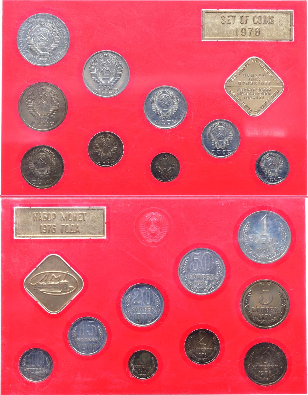 Ленинградский монетный двор. Жесткий пластик. В набор входят: алюминиевый жетон ЛМД квадратной формы со скругленными краями, годовая плашка, 1 рубль, 50 копеек, 20 копеек, 15 копеек, 10 копеек, 5 копеек, 3 копейки, 2 копейки, 1 копейка. Петров, Федорин 329, 330, 332(Р), 333, 334, 337, 339, 342, 344. BUNC.