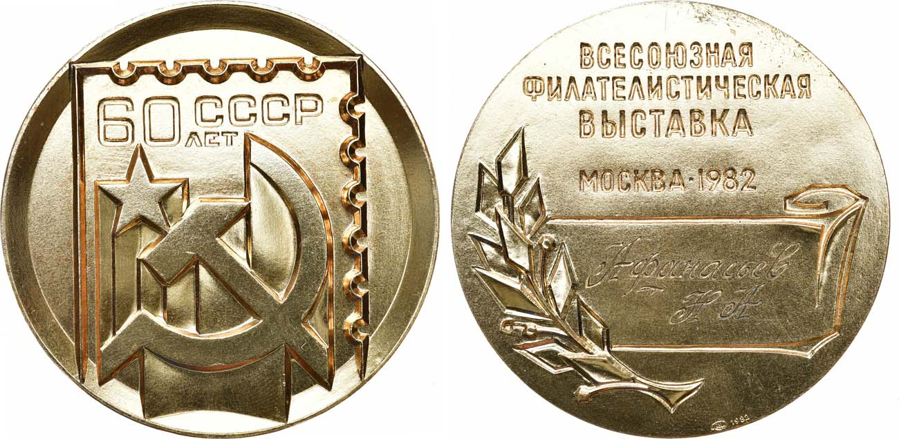 Томпак, золочение. 115,14г. Диаметр 60 мм. Ленинградский монетный двор. Медальер Г.Ф. Краснослободцев (без подписи). Тираж 60 экз. Реверс: гравировка в картуше "Афанасьев Н.А.". Шкурко, Салыков 1428. UNC.