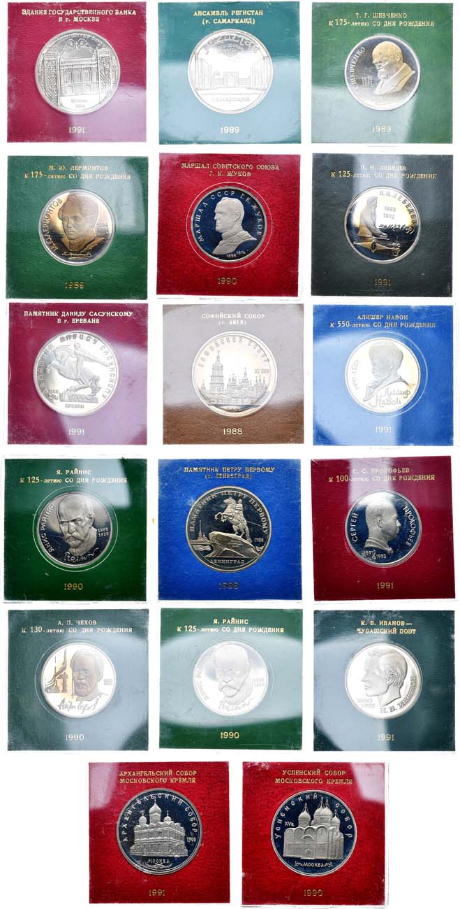 Медно-никелевый сплав. 5 рублей 1988 года. Памятник Петру I в Ленинграде. PROOF. 5 рублей 1988 года. Софийский собор в Киеве. PROOF. 5 рублей 1989 года. Ансамбль Регистан в Самарканде. PROOF. 1 рубль 1989 года. 175 лет со дня рождения М.Ю. Лермонтова. PROOF. 1 рубль 1989 года. 175 лет со дня рождения Т.Г. Шевченко. PROOF. 5 рублей 1990 года. Успенский собор Московского Кремля. PROOF. 1 рубль 1990 года. Маршал Советского Союза Г.К. Жуков. PROOF. 1 рубль 1990 года. 125 лет со дня рождения Я. Райниса. PROOF. 1 рубль 1990 года. 125 лет со дня рождения Я. Райниса. PROOF. 1 рубль 1990 года. 130 лет со дня рождения А.П. Чехова. PROOF. 5 рублей 1991 года. Здание Государственного банка в Москве. PROOF. 5 рублей 1991 года. Архангельский собор Московского Кремля. PROOF. 5 рублей 1991 года. Памятник Давиду Сасунскомуц в Ереване. PROOF. 1 рубль 1991 года. 100 лет со дня рождения К.В. Иванова. PROOF. 1 рубль 1991 года. 100 лет со дня рождения С.С. Прокофьева. PROOF. 1 рубль 1991 года. 125 лет со дня рождения П.Н. Лебедева. PROOF. 1 рубль 1991 года. 550 лет со дня рождения Алишера Навои. PROOF. PROOF.