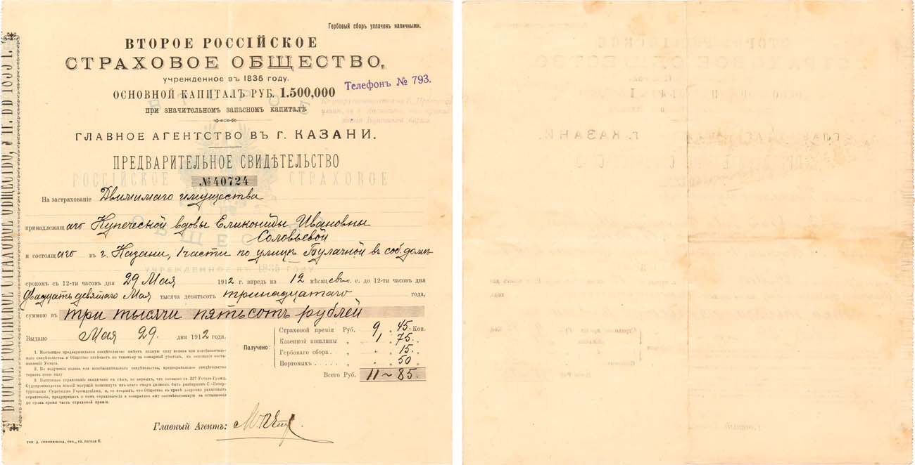 Предварительное свидетельство №40724 от 29 мая 1912 года, на страхование имущества купеческой вдовы Еликониды Ивановны Соловьевой, сроком на 1 год, на сумму 3500 рублей AU.