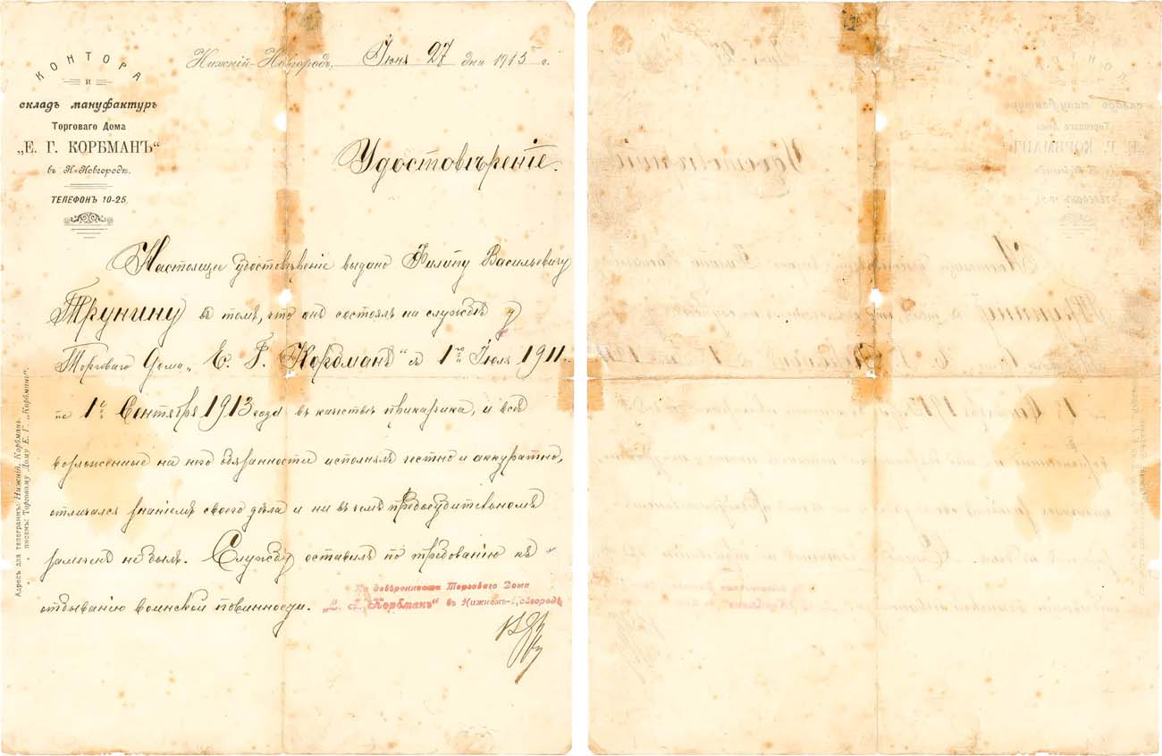 Удостоверение выдано Филипу Васильевичу Трунину, в том что он состоял на службе в качестве приказчика, свои обязанности исполнял честно и аккуратно, отличался знаниями и ни в чем не предосудительном замечен не был. Службу оставил по требованию воинской повинности. VF.