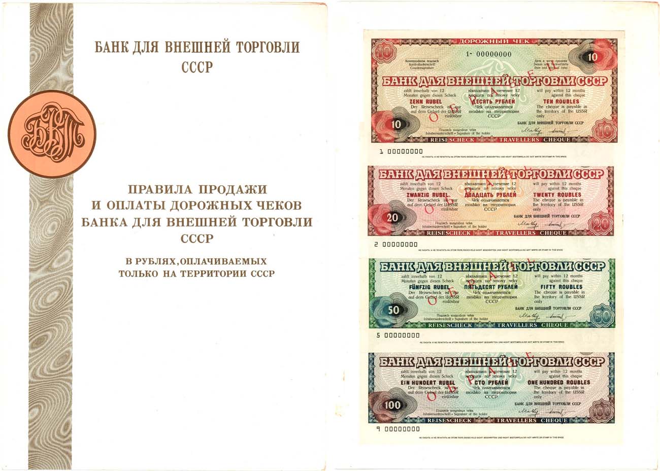 В буклет вклеены четыре дорожных чека номиналом 10, 20, 50 и 100 рублей. Текст на чеках выполнен на трех языках: русском, немецком и английском. На каждом чеке надпечатка по диагонали ОБРАЗЕЦ. Первый выпуск с текстом внизу на белом поле по центру. На внутренней стороне первой страниц размещены правила продажи и оплаты чеков. Макеев/Никиткин, Истомин №№ 7.14.1s - 7.14.4s. UNC.