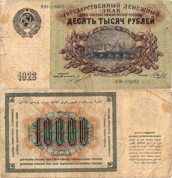 Серия ЯЮ-10003. Наркомфин: Г.Я. Сокольников, кассир: А. Беляев. Кардаков №I.4.301 (1 дойчмарка). ZG2 №2.10.1. Денисов 177.1. Pick 181. VF.