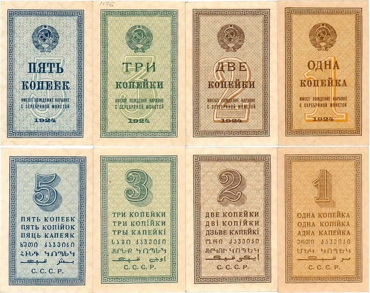 1 копейка 1924 года. ZG2№2.20.1. Денисов 195.1. Pick 193. UNC. 2 копейки 1924 года. ZG2№2.20.2. Денисов 196.1. Pick 194. UNC. 3 копейки 1924 года. ZG2№2.20.3. Денисов 197.1. Pick 195. UNC. 5 копеек 1924 года. ZG2№2.20.4. Денисов 198.1. Pick 196. UNC.