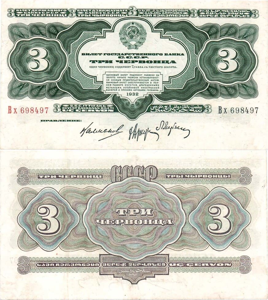 Билеты Государственного банка СССР 3 червонца 1932 года поступили в обращение в сентябре 1932 года. Билет в 3 червонца образца 1932 года оставался в обращении до денежной реформы 1947 года.