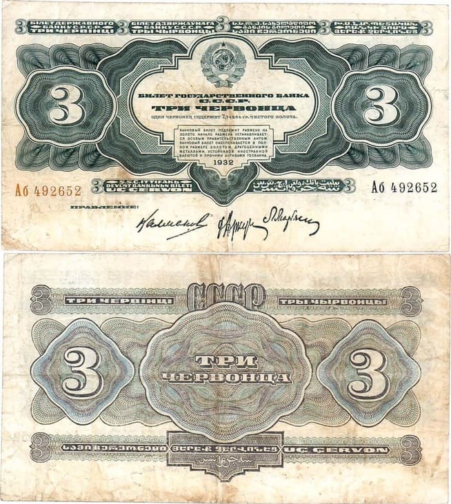 Билеты Государственного банка СССР 3 червонца 1932 года поступили в обращение в сентябре 1932 года. Билет в 3 червонца образца 1932 года оставался в обращении до денежной реформы 1947 года.