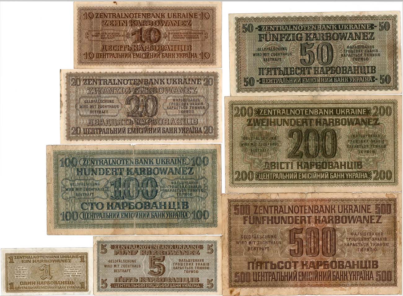 500 карбованцев 1942 года. Серия З•304958. Размер 185х104 мм. Grabowski ZWK-55. (Перегибы. Потери). VF-. 200 карбованцев 1942 года. Серия 1•7603573. Размер 181х98 мм. Grabowski ZWK-54. (Перегибы). VF. 100 карбованцев 1942 года. Серия 13•098786. Размер 178х92 мм. Grabowski ZWK-53a. (Перегибы). VF-. 50 карбованцев 1942 года. Серия 18•484069. Размер 173х85 мм. Grabowski ZWK-52a. (Перегибы). VF. 20 карбованцев 1942 года. Серия 9•134299. Размер 165х75 мм. Grabowski ZWK-51a. (Перегиб). XF. 10 карбованцев 1942 года. Серия 18•0073788. Размер 150х68 мм. Grabowski ZWK-50. (Перегибы). XF-. 5 карбованцев 1942 года. Серия 43•0116139. Размер 130х60 мм. Grabowski ZWK-49. XF-. 1 карбованец 1942 года. Серия 146•0002951. Салатовый фон. Размер 93х48 мм. Grabowski ZWK-47. (Перегибы). VF/XF. VF-/XF.