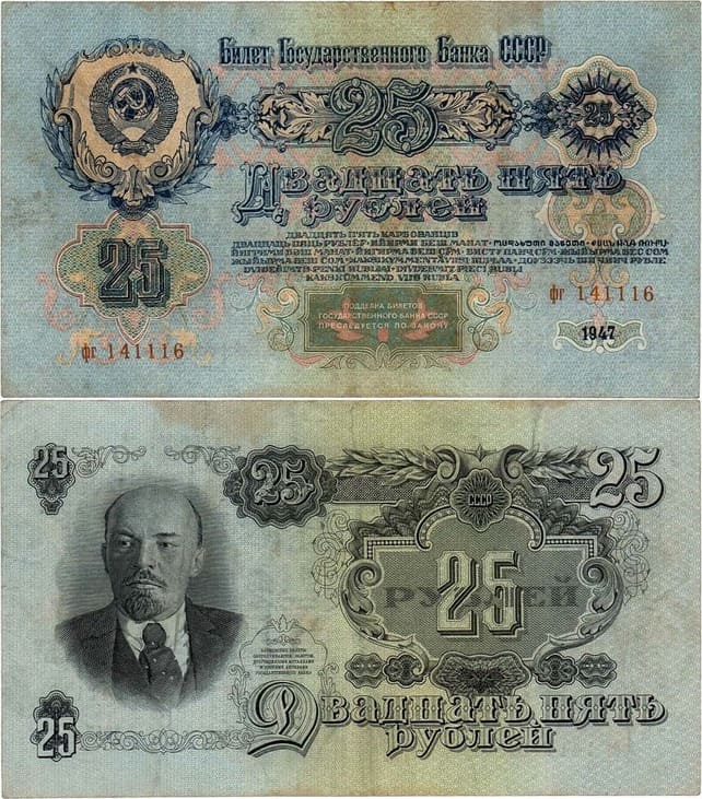 Согласно совместному постановлению Совета Министров СССР и ЦК ВКП(б) от 14 декабря 1947 года. О проведении денежной реформы и отмене карточек на продовольственные и промышленные товары» с 16 декабря 1947 года были выпущены в обращение билеты Государственного банка СССР номиналами 10, 25, 50 и 100 рублей образца 1947 года и Государственные казначейские билеты образца 1947 года номиналами 1, 3 и 5 рублей. В 1957 в связи с изменением герба СССР состоялся обновленный выпуск денежных знаков. Денежные знаки СССР образца 1947 года находились в обращении до 1 апреля 1961 года. Обмен их на новые денежные знаки образца 1961 года производился со 2 января 1961 года без ограничения суммы.