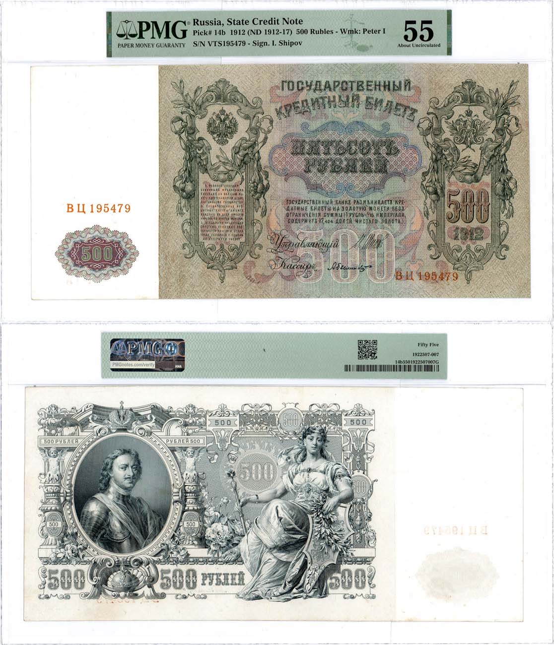 Российская Империя. Государственный Кредитный билет. 500 рублей 1912 года. Шипов/Былинский. В слабе PMG 55 About Uncirculated.