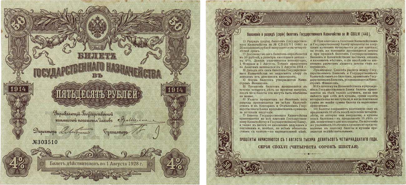 №303510. Денисов КБ-22.1. Серии - 446 / Лебединский С. Указ о выпуске от 22 августа 1914г.. Ежегодный доход - 4%. Проценты начисляются с 1 августа 1914г. XF/AU.
