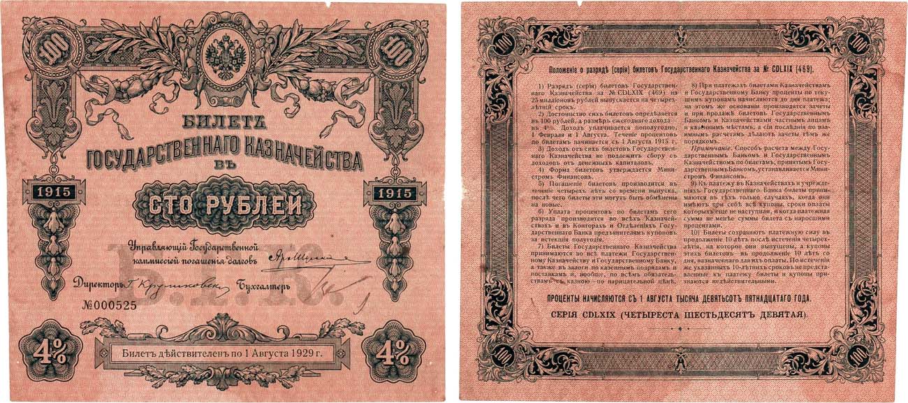 №000525. Денисов КБ-23.3. Серии - 469 / Круликовский Г. Указ о выпуске от 14 августа 1915г. Ежегодный доход - 4%. Проценты начисляются с 1 августа 1915г. XF-.