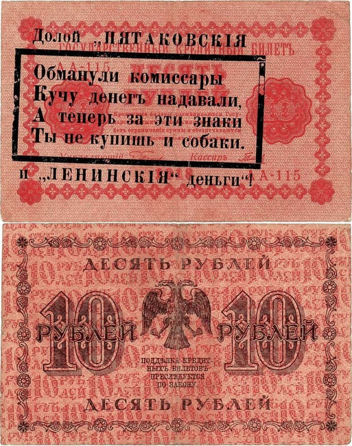 Агитационная надпечатка на государственном кредитном билете 10 рублей 1918 г. Серия АА-115. Управляющий Г.Л. Пятаков. Кассир Стариков. Надпечатка ОСВАГа: «Долой «Пятаковския» и «Ленинския» деньги! Обманули комиссары кучу денег надавали, а теперь за эти знаки ты не купишь и собаки». Кардаков XX.1.15а (15 дойчмарок). VF/VF+.