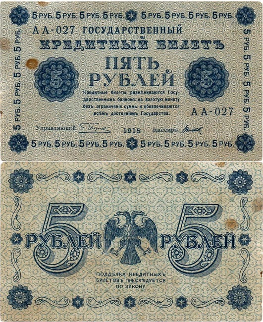 Государственные Кредитные Билеты образца 1918 г. выпущены на основании декретов СНК РСФСР от 15 мая 1919 г и 21 октября 1919 г. В обращении до 1922 г.