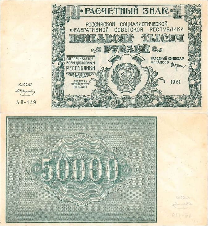 Серия АЛ-149. Народный Комиссар Финансов: Н.Н. Крестинский, кассир: Миронов. Водяной знак: большие теневые звезды. ZG2 №2.6.28. UNC.