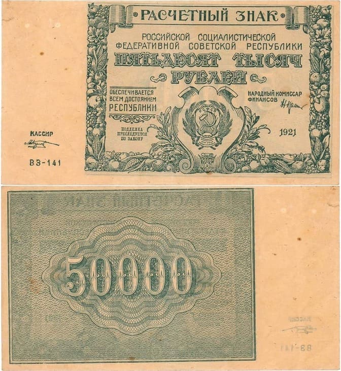 Серия ВЗ-141. Подписи: Нарком Финансов - Н.Н. Крестинский, кассир - Козлов. В/з большие теневые звезды. ZG2 №2.6.28. Денисов 140.2b. Pick 116a. XF-.