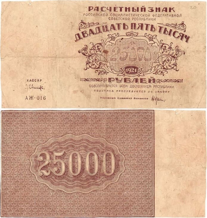 Серия АЖ-016. Народный Комиссар Финансов: Н. Крестинский. Кассир: Оникер. Крупные теневые 6-лучевые звезды. Кардаков I.4.239а. ZG2 №2.6.26. F/VF.