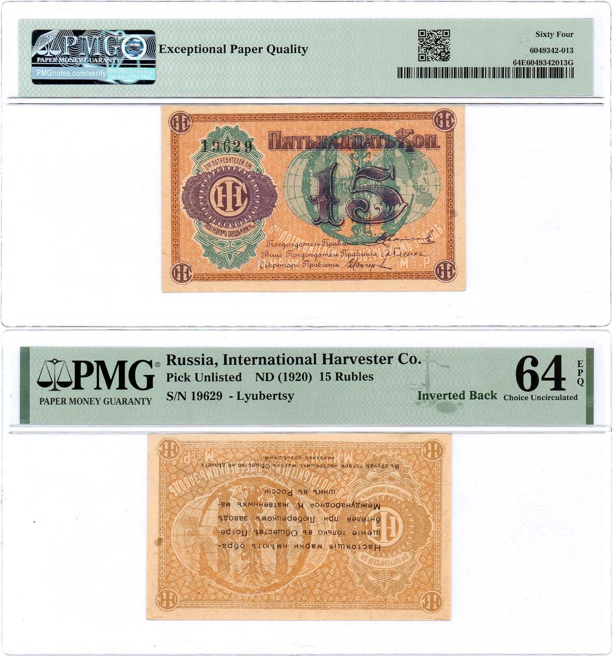 Номер №19629. Текст и виньетка фиолетовые, Реверс перевернут, без печати. Рябченко 8859 (20 д.). 64 EPQ Choice Uncirculated.