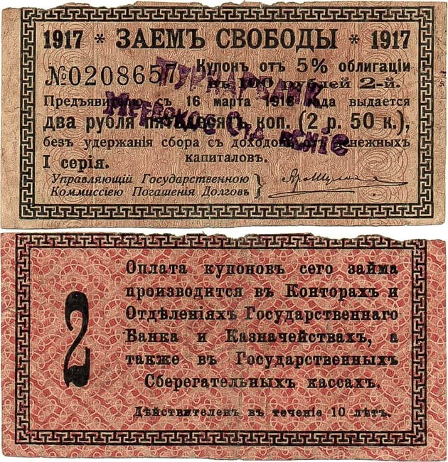 В связи с острой нехваткой наличных денежных знаков в стране Постановлением Народного Комиссариата по финансовым делам №509 от 30 мая 1918 года в обращение введены в качестве денежных знаков облигации "Займа Свободы" достоинством не выше 100 рублей и купоны государственных процентных бумаг (государственные ренты, внутренние и военные заемы, Займа Свободы) всех достоинств (закладных листов Дворянского и Крестьянского банков), сроком погашения по 1 декабря 1917 года. Они использовались без всяких надпечаток и печатей. Позднее в 1918-1919 годах облигации займа Свободы, краткосрочные обязательства и купоны (более поздних сроков погашения, чем указано в постановлении) к ним и другим государственным процентным бумагам широко использовались с наложением штампов, надпечаток, надписей по всей территории бывшей Российской Империи. Выпуск осуществлялся от имени местных Казначейств, Отделений Государственного или Народного банков.