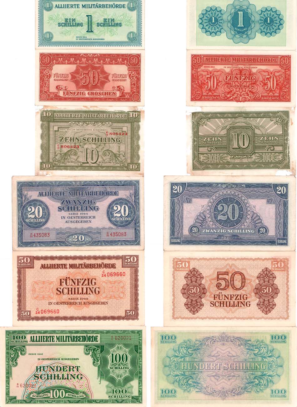 100 шиллингов 1944 года. серия В/15 620021. Серия - светло-красная, маленькая. Konstner KK105d. Pick 110a. UNC-. 50 шиллингов 1944 года. серия C/24 069660 . Konstner KK104. Pick 109. UNC-. 20 шиллингов 1944 года. серия D/30 435083. Konstner KK103a. Pick 107. XF-. 10 шиллингов 1944 года. серия E/19 806423. Серия - светло-красная. Konstner KK103a. Pick 101b. VF-. 1 шиллинг 1944 года. В/з волнистые линии. Konstner KK98b. Pick 103b. UNC-. 50 грошей 1944 года. В/з волнистые линии. Konstner KK97b. Pick 102b. AU-. UNC-/VF-.