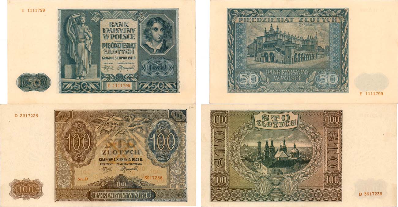 Польша. Эмиссионный банк Польши. Германская Оккупация. Лот из 2 бон. 50 и 100 злотых 1941 года.